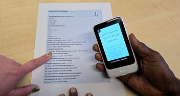 Ein weiterer Bestandteil ist der Einsatz von Pocketalk-Übersetzungsgeräten, die eine Echtzeit-Übersetzung in über 80 Sprachen ermöglichen. Im Eingangsverfahren und im Berufsbildungsbereich wird es nun mit den Pocketalk-Geräten möglich, Berufliche Bildung nicht deutschsprachigen Menschen zugänglich zu machen, sei es bei dem Ausfüllen der Zufriedenheitsbefragung oder bei dem Verstehen einer Bildungsanleitung. Damit helfen die Übersetzer, sprachliche Barrieren abzubauen und fördern gleichberechtigte Teilhabe am Arbeitsleben.